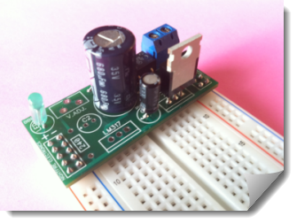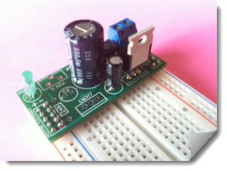 NightFire Electronics has a great little 5V power supply that is built to plug right into your breadboard. It sells for just under $8, but for just a few dollars more you can get one that is fully built and tested. I really didn't need another unfinished project staring at me, so I chose to spend the $12 and get the assembled one.