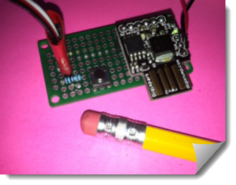 I spent the evening messing around with hardware and built up a little board that allows me to plug both the Digispark and my LCD display into it. It includes the two pull up resistors, a push button and the pull down resistor that requires. I soldered in red and black jumpers so that I can plug into a 5V power source and be good to go. Sparky rides higher than the proto board on two headers. The pull up resistors are not visible in the photo because they are underneath the Digispark board. I soldered in a set of four stand up pins that lets me plug my LCD cable into the project.tick = 0;